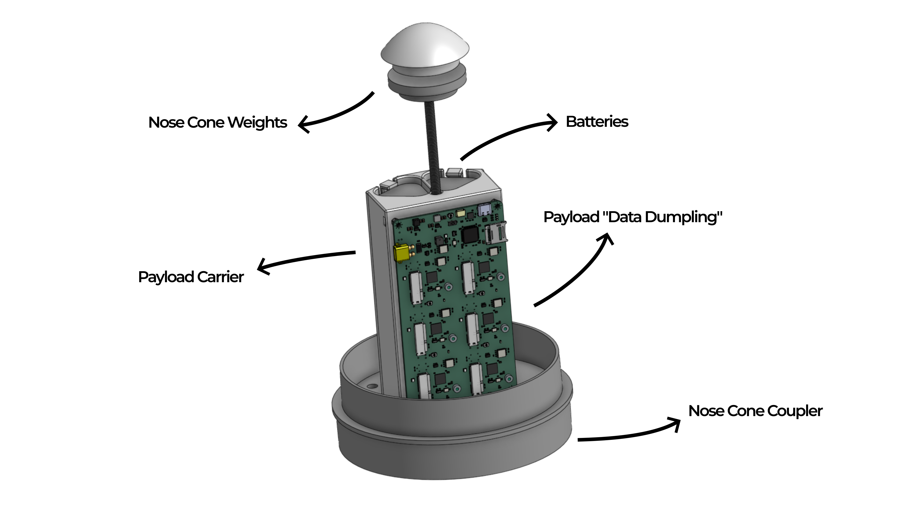 I also designed the payload holder, placing it in the nosecone to improve rocket stability while meeting the weight and size constraints of the competition. The nosecone itself was designed for quick removal to allow easy troubleshooting during testing and launch preparation.