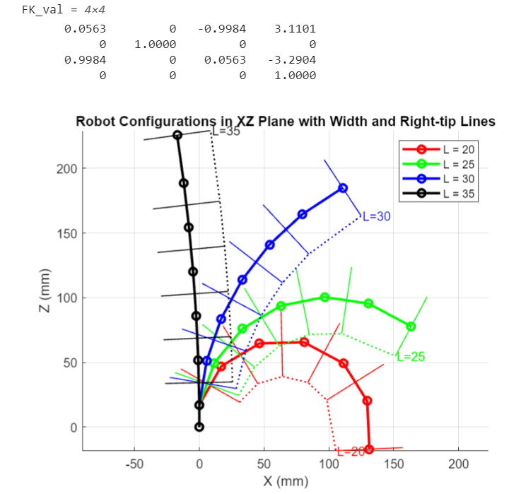 After reading through textbook passages assigned by Yilin, I developed a forward kinematics model of the robot in planar motion where the bend angle would be controlled by change in Tendon Length. I'll be developing 3D kinematics next and validate with Mujoco simulations before applying spring stiffness and motor torques to create a force/moment balance to calculate grip force. (Oct -7, 2025)