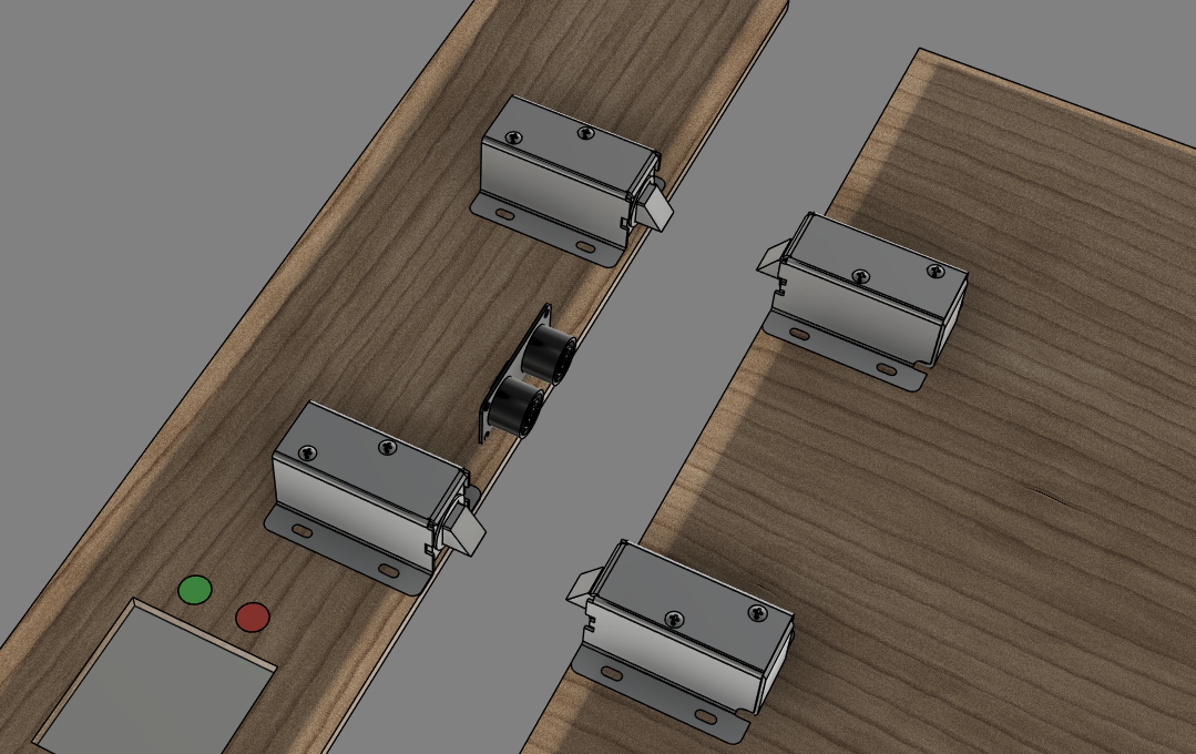 Two solenoid locks block the plates from sliding out. When the scan is approved, the solenoids retract (unlocking the plates), and a green light turns on. The ultrasonic sensor detects when a plate is taken and reengages the solenoids. If denied (student not subscribe), a red light stays on, and the locks stay engaged.